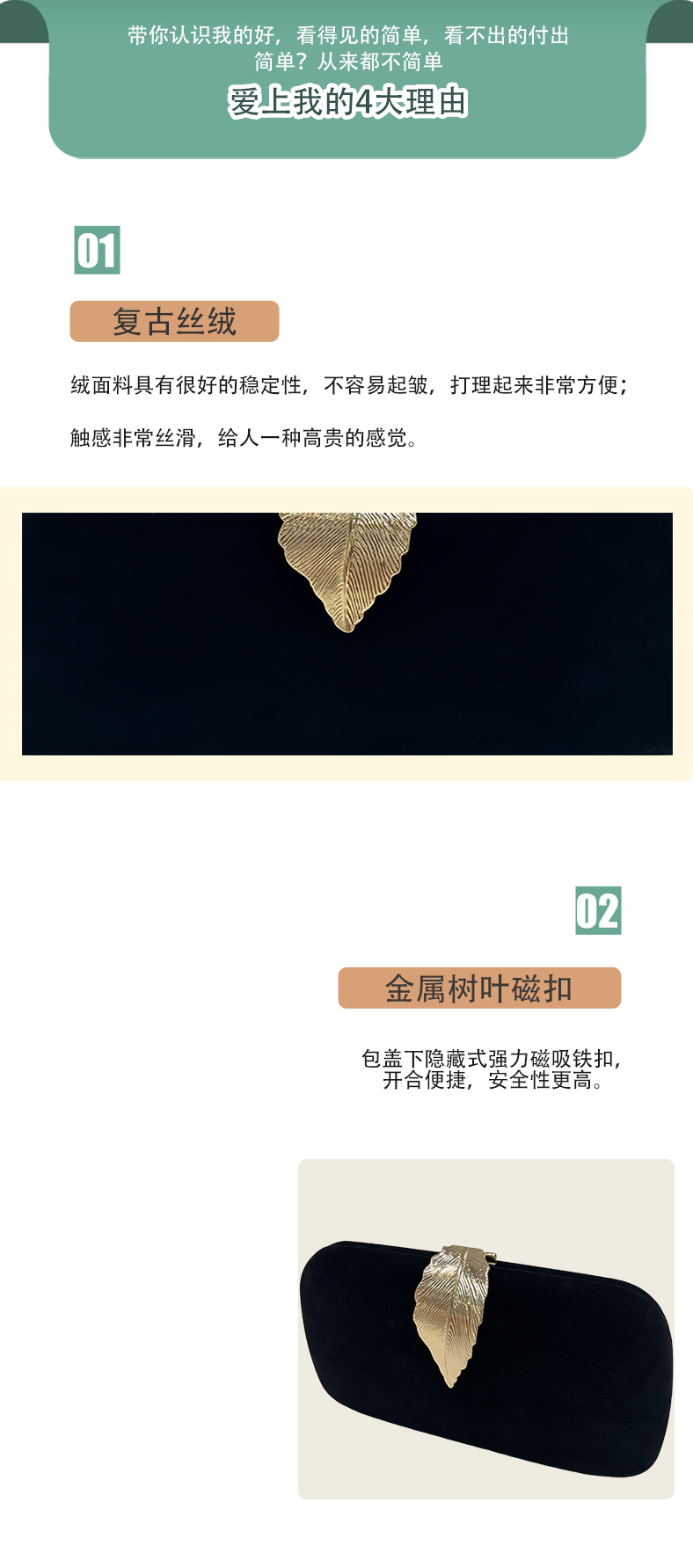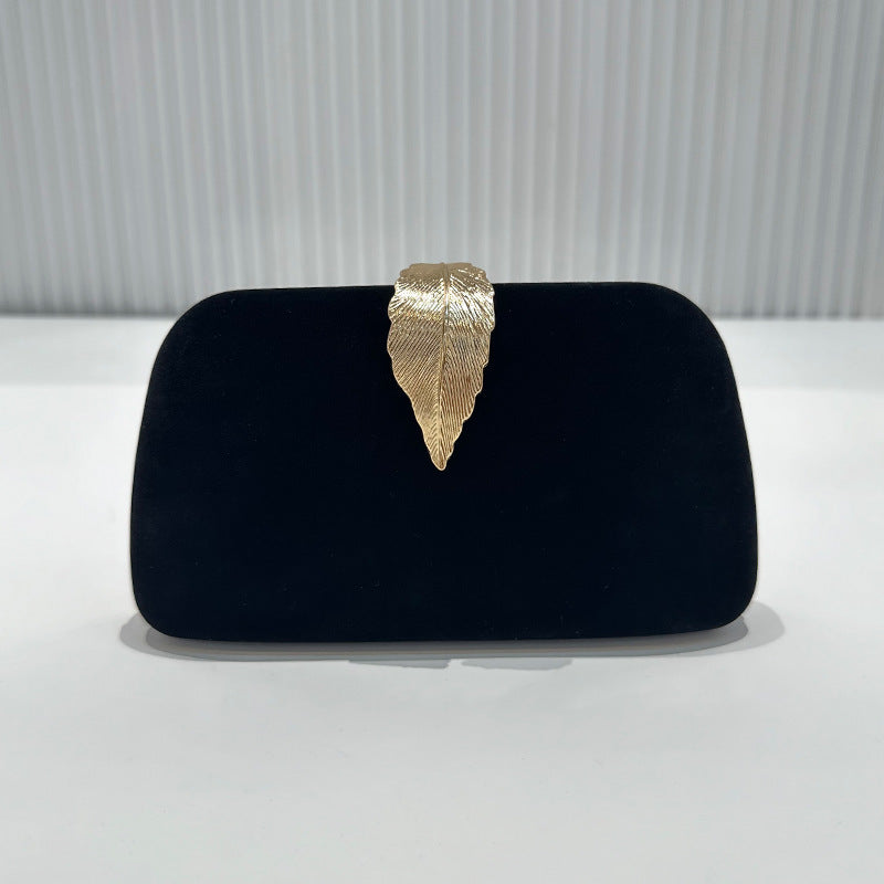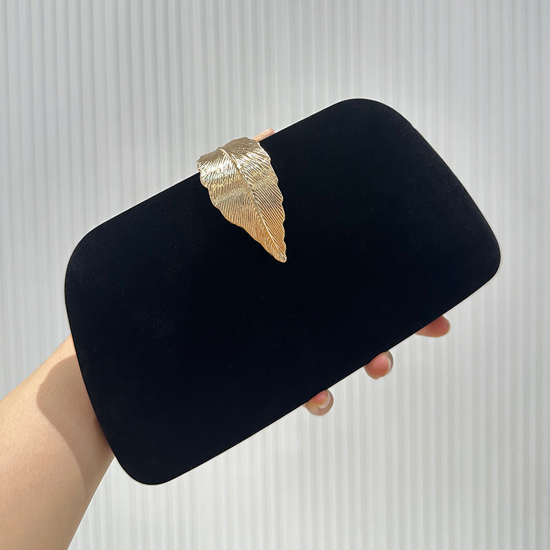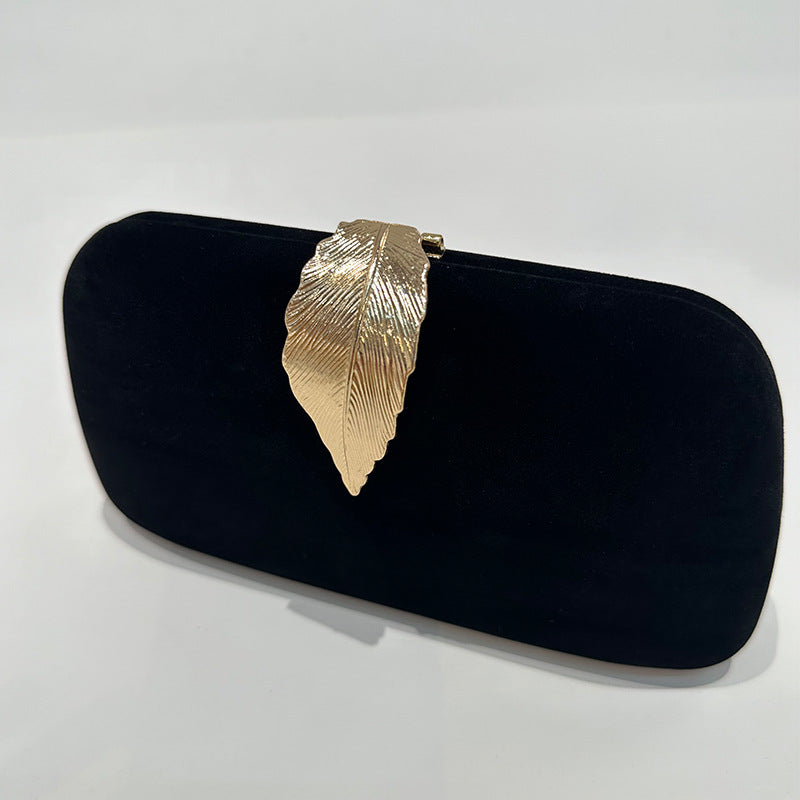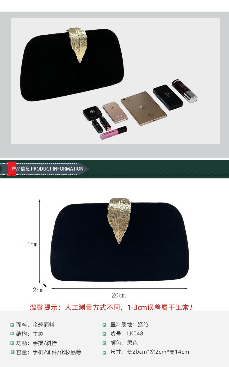 Cross-border spot hand-held dinner bag, box bag, fine flash leaf decorative dress bag, black flannel banquet bag.